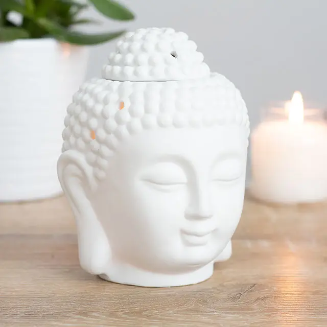Deze olie- en waxbrander in de vorm van een Boeddha-hoofd is uitgevoerd in mat wit keramiek. Het rustige design creëert direct een zen-sfeer en is perfect om je favoriete geuren te verspreiden. Geschikt voor zowel etherische olie als waxmelts en een prachtige aanvulling voor een meditatieve of spirituele woonstijl.