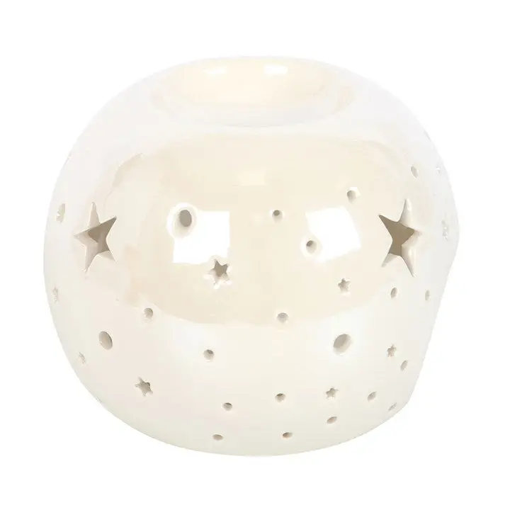 Deze witte iriserende olie- en waxbrander combineert elegantie met een vleugje speelsheid. De parelmoerachtige afwerking glinstert subtiel mee met het licht, terwijl de stervormige uitsparingen zorgen voor dromerige lichtreflecties. Perfect te combineren met ontspannende geuren om een rustgevende en betoverende sfeer te creëren.