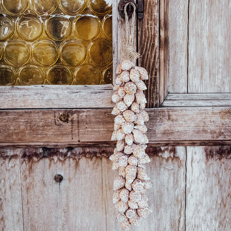 Creëer een tropische sfeer door meerdere schelpstrengen naast elkaar te hangen of te combineren met bamboe- en rotandecoratie.