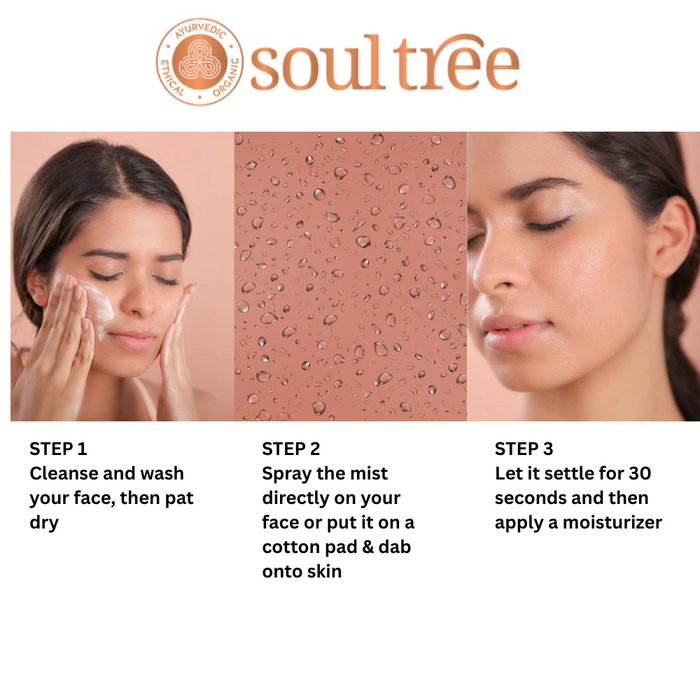 Deze zachte toning mist van SoulTree verfrist, hydrateert en kalmeert de huid gedurende de dag. De ayurvedische formule met puur rozenwater en aloë vera helpt de poriën te verfijnen en ondersteunt een egale, frisse huid. Geschikt voor droge tot normale huid en ideaal als dagelijkse verfrissing of als lichte toner na het reinigen.